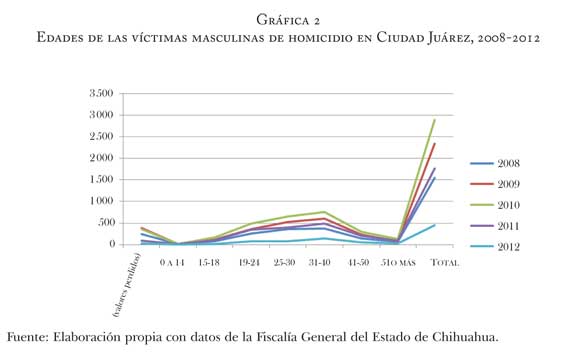 De 2008 a 2011 se registraron más de 10 000 asesinatos violentos en Ciudad Juárez; 400 correspondieron a mujeres, mientras que 95% de las víctimas fueron hombres, en su mayoría jóvenes. El término juvenicidio, si bien se ha empleado para nombrar el asesinato mayoritario de jóvenes en el país, pierde de vista las especificidades de aquellos que han sido víctimas del combate al crimen organizado y de las políticas de seguridad, pues son hombres que corresponden a sectores barriales y vinculados con clicas o gangas juveniles;2 a la mayoría se les atribuía participación en actividades delictivas. Sus características coincidentes eran ser hombres, pobres y estigmatizados, como los llamados cholos.