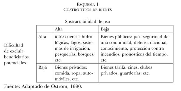 El esquema 1 aporta una representación general de los cuatro grandes tipos de bienes que determinan de manera diferenciada los problemas que los individuos enfrentan al diseñar instituciones que les permitan proveer, producir y consumir diversos bienes. Estos cuatro grandes tipos incluyen muchos subtipos que varían sustancialmente en relación con muchos atributos. Por ejemplo, un río y un bosque son ambos bienes de uso común que varían en relación con la movilidad de las unidades del recurso, la facilidad de medición, la escala temporal de su regeneración y otros atributos importantes. Diversos recursos de uso común difieren en relación con la escala espacial, el número de usuarios y muchos otros factores.