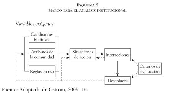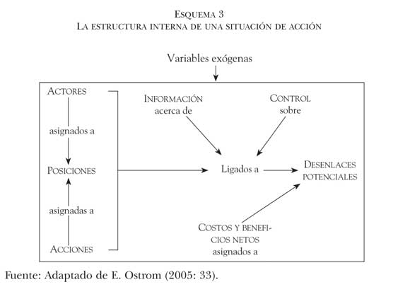 Según se muestra en el esquema 3, éstas son las partes funcionales internas de una situación de acción. Como se discutió, el uso de un marco común en una variedad amplia de estudios ha permitido acumular comprensión sobre las interacciones y sus resultados en ambientes complejos. El marco IAD expresamente anida una situación particular en variables externas, algunas de las cuales pueden monitorearse a lo largo del tiempo.
