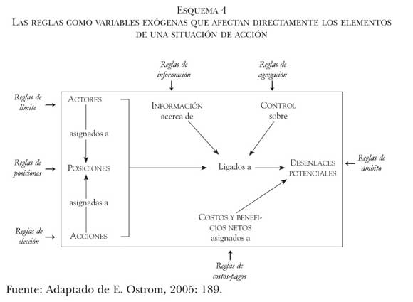 3. Las reglas en uso expresan específicamente la comprensión compartida de los participantes en relación con temas como: quiénes deben, no deben, o podrían llevar a cabo qué acciones, y quiénes a su vez pueden afectar a otros sujetos con sanciones (Crawford y Ostrom, 2005). Las reglas en uso pueden evolucionar en el tiempo, a partir de que algunos participantes en una cierta acción interactúen con otros en una variedad de situaciones (Ostrom, 2008; Ostrom y Basurto, en prensa; Boyd y Richerson, 1985), o a partir de cambios conscientes de las reglas en una arena de elección colectiva o de elección constitucional. El conjunto de variables externas impacta la situación de acción, generando patrones de interacciones y resultados que son evaluados por los participantes en la situación de acción (y potencialmente por académicos), retroalimentando las variables externas y la situación de acción.
