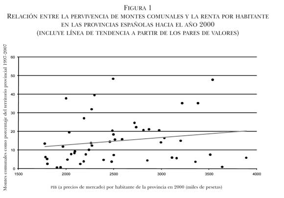 La persistencia de estas formas de propiedad colectiva no ha tenido efectos negativos sobre las posibilidades de crecimiento económico. Basta para demostrarlo el sencillo ejercicio que se propone en la figura 1. Se pone en relación ahí la superficie de montes de entidades locales (se han excluido, respecto de la tabla 1, los montes pertenecientes al Estado y a las comunidades autónomas) y montes vecinales en mano común, expresada como porcentaje del territorio provincial, y el producto interior por habitante a precios de mercado de cada provincia en el año 2000, el indicador de riqueza económica más al uso.24 No importa tanto el grado de correlación existente entre ambas variables (0.178), sino el signo del mismo, que es positivo. Si no podemos afirmar a ciencia cierta a partir de estos datos que la pervivencia de los bienes comunales sea una condición favorable para el crecimiento económico, sí podemos asegurar que no es un obstáculo para el mismo.
