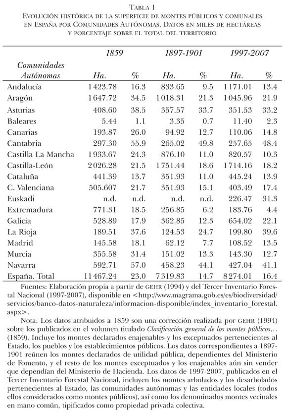 Veamos con algo más de detenimiento el caso español. A juzgar por los catálogos de montes elaborados por los ingenieros de la administración central del Estado, se privatizaron en España durante la segunda mitad del siglo XIX más de cuatro millones de hectáreas (tabla 1), con particular incidencia del proceso en la mitad sur del país (comunidades de Castilla La Mancha, Extremadura, Andalucía y Murcia) y en el valle medio del Ebro (Aragón y Navarra). Esto coincide a grandes rasgos con las regiones cálidas de llanura que albergaban, bajo la forma de dehesas (fincas acotadas de gran extensión para la producción herbácea espontánea), los tradicionales pastos de invierno para los rebaños trashumantes. La crisis de la trashumancia y la demanda de cereales de una población en aumento impulsaron en estas zonas un verdadero proceso de colonización interior con una expansión muy notable de la superficie cultivada de secano (dry-farming), que reforzó el proceso de privatización y la consolidación de un delgado estrato social de grandes terratenientes. En otras zonas del país el proceso privatizador fue menos intenso, lo que revela una mayor resistencia de las comunidades rurales a perder el control colectivo de sus recursos. Se trata, por regla general, de zonas caracterizadas por un poblamiento disperso en pequeños núcleos de población, ya fueran zonas de montaña, ya áreas en las que predominaba la pequeña propiedad familiar. Un tipo de hábitat humano similar a las "repúblicas de aldea" descritas por Wade (1994) y por Netting (1981).