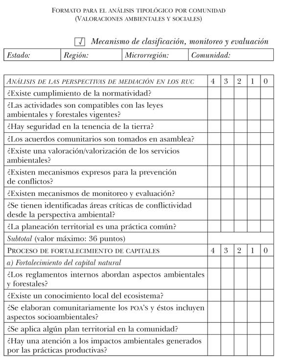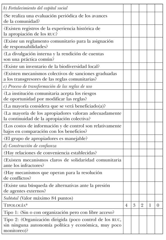 A continuación se presenta una propuesta de lista de evaluación (check list) como base para la indagación y clasificación de las características de las comunidades implicadas en acciones colectivas. La utilidad práctica estriba en contar con una calificación y una valoración de las condiciones de las instituciones de acción colectiva, diseñar mecanismos preventivos de negociación de conflictos socioambientales, monitorear su desempeño y contar con elementos para proponer ajustes que ayuden a mejorar la gobernanza y el manejo de los recursos naturales colectivos.
