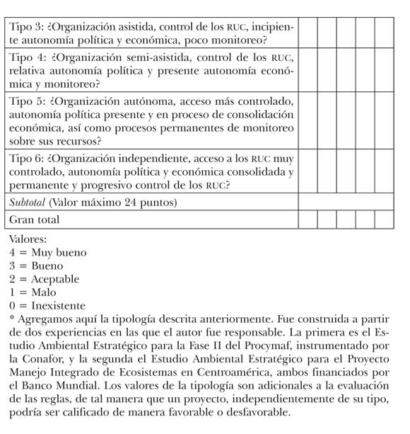 Tipo 6. Organizaciones independientes. Las organizaciones agrupables en esta categoría regulan plenamente el acceso a los recursos naturales y tienen autonomía política en el marco de la normatividad vigente. Este nivel de autonomía las distingue del resto de las experiencias mencionadas. La confianza filial y la grupal están fuertemente entrelazadas. En muchas de estas asociaciones existe un elemento adicional de pertenencia, ya sea un recurso natural exclusivo, un área de conservación comunitaria, una condición étnica-cultural particular, etcétera. La autonomía económica está acompañada por una clara rendición de cuentas y los mecanismos de capacitación operan en forma eficiente en el interior del colectivo. No requieren la intervención de agentes externos para vigilar y monitorear el cumplimiento de sus reglas de uso. Las infracciones a las reglas se presentan muy raramente, pues dichas reglas son graduales pero efectivas. Las instituciones comunitarias están consolidadas y hay mecanismos claros para la resolución de conflictos; la comunidad tiene certeza de que el cambio de statu quo y la búsqueda de opciones económicas le serán favorables. En general, son organizaciones con años de experiencia.