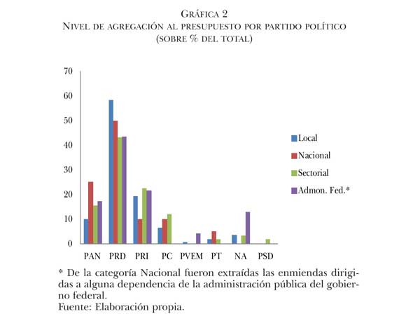 Además del objetivo territorial, en la gráfica 2 destaca que los diputados del PRD realizaron cerca de 50% de las modificaciones al presupuesto. Impulsaron cambios para dotar de recursos de enfoque nacional, así como a ciertos sectores y a la administración pública federal. Destaca, asimismo, que el Partido Acción Nacional (PAN), gobernante, basara sus modificaciones en el ámbito nacional y que el PRI se enfocara, en proporciones similares, a conseguir recursos para determinados sectores y para distintas dependencias del gobierno federal, pasando a un tercer plano el enfoque territorial. Dentro de los partidos pequeños, Convergencia priorizó a los sectores que consideró relevantes para atraer recursos hacia ellos, mientras que Nueva Alianza (NA) primó la obtención de recursos para la administración del gobierno federal.