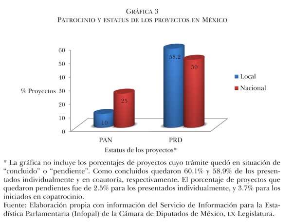 Si se presta atención a la estrategia de iniciación de proyectos sectoriales y locales, se percibe que 58.5% y 66.1% de éstos, respectivamente, fueron llevados a comisión de manera individual. Ello evidencia un comportamiento en la forma de presentar proyectos sectoriales y locales y otro en la de iniciar los nacionales. Es decir, los diputados recurren la mayor parte del tiempo a la vía personal para iniciar política territorial y sectorial, mientras que cuando se trata de un nivel más agregado lo hacen por la vía partidista. Esto puede estar asociado tanto con el éxito posterior de los proyectos nacionales, dado que la acción colectiva aumenta la capacidad de negociación del grupo y disminuye los costos de transacción, como con el deseo de “cultivar una reputación personal” (Béjar, 2012: 634).