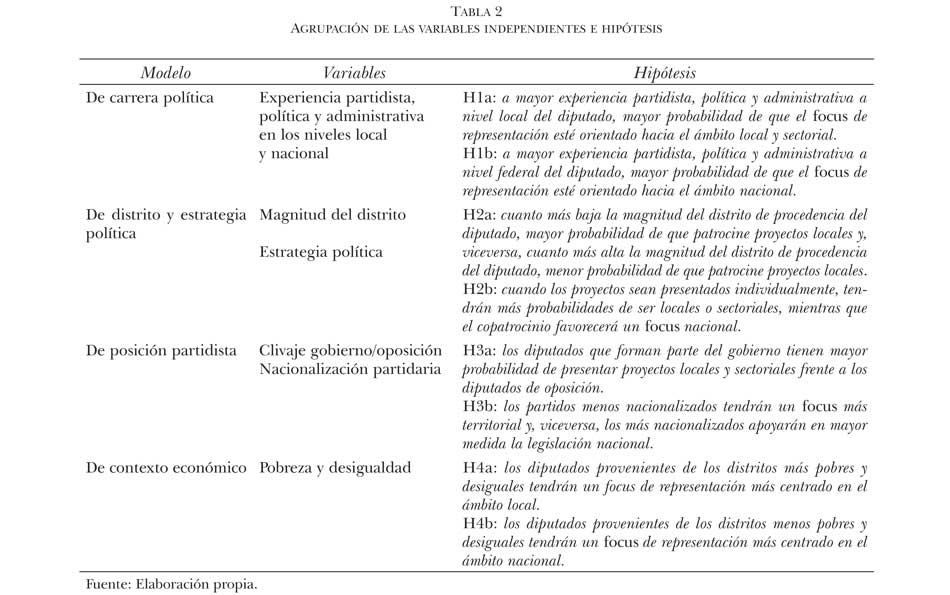 Como es bien sabido, las funciones que desempeñan los congresistas se ven afectadas por una serie de factores asociados con el sistema político y partidista al contexto en el que se desenvuelve su labor parlamentaria y a la experiencia profesional. Una vez descrita la operacionalización de la variable dependiente, este apartado tiene como objetivo delimitar las variables propuestas en la literatura politológica como elementos causales que pueden condicionar el comportamiento legislativo y exponer las principales hipótesis que serán sujetas a contraste empírico en el último apartado. Para una mejor comprensión y bondad en el análisis, las variables predictoras quedaron divididas en los siguientes cuatro modelos: 1) de carrera política; 2) de distrito y estrategia legislativa; 3) de posición partidista, y 4) de contexto socioeconómico.