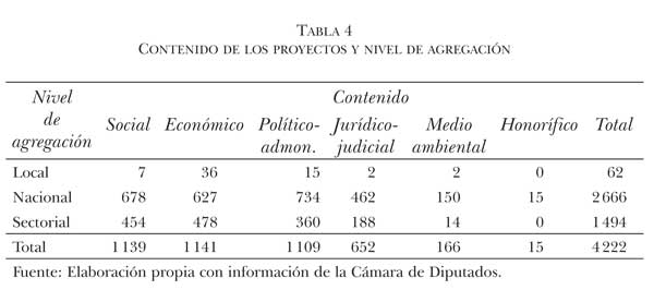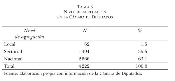 Para identificar el enfoque tanto de los proyectos como de las enmiendas y establecer el objetivo al que estuvieron dirigidos, se optó por clasificarlos según el nivel de agregación adoptando criterios de la tipología que inicialmente propuso Giuseppe Di Palma (1976) y que más tarde rescataron Michelle Taylor-Robinson y Christopher Díaz (1999).8 De modo que los proyectos fueron divididos en tres categorías de la dimensión nivel de agregación: 1) local —cuando estuvieron dirigidos a una municipalidad, ciudad o estado de la federación—; 2) sectorial —si hicieron referencia expresa a un sector de la población, como organismos empresariales, grupos éticos, asociaciones profesionales o partidos políticos—, y 3) nacional —si incluyeron expresa o implícitamente a toda la población o a todos los estados, regiones o municipios (ver tabla 1).9