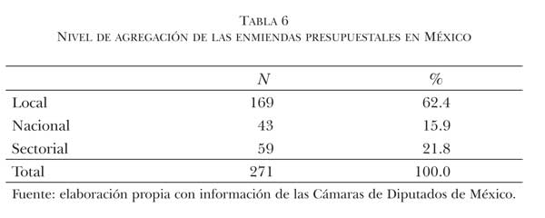 Tras recopilar los puntos de acuerdo por los que los diputados solicitan al Ejecutivo federal integrar cambios a los proyectos presupuestales de egresos de 2007, 2008 y 2009, se desprende que el ámbito local es prioritario para los diputados cuando tratan de redistribuir recursos. En esta tesitura fueron incorporadas casi dos de cada tres enmiendas del total (62.4%). En la solicitud de recursos, el ámbito de agregación nacional ocupó un lugar poco relevante, el menos recurrido, al someterse sólo 43 enmiendas en los tres años de la legislatura. Este dato contrasta con el apoyo que recibieron los proyectos de ley de enfoque nacional.