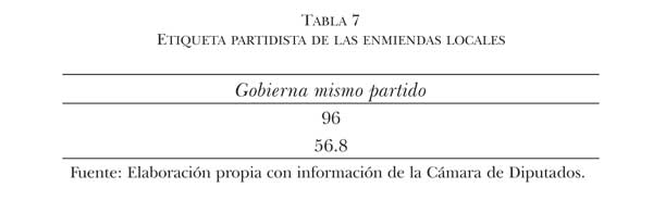 En la siguiente tabla se aprecia que la atracción de beneficios territorialmente concentrados está vinculada con la ideología política. El número de enmiendas presentadas cuando gobierna en su estado el mismo partido político que los posicionó en la Cámara es mayor que cuando gobierna la oposición; se presentaron a lo largo de los tres años de legislatura 96 enmiendas cuando fueron del mismo partido y 73 modificaciones presupuestales cuando gobernó uno diferente.