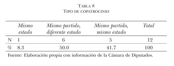 Con respecto a la presentación colectiva de enmiendas por afinidades ideológicas o territoriales, durante la LX Legislatura el copatrocinio partidista fue la forma más común por la que los diputados realizaron modificaciones al presupuesto. De las 12 enmiendas presentadas por la vía grupal, en 11 de ellas participaron miembros del mismo partido. En cinco de estas últimas estuvo presente, además de la afinidad partidista, el elemento territorial al integrarse el copatrocinio por miembros del mismo estado. Sólo una enmienda en coautoría se conformó por legisladores de distintas fuerzas políticas pero del mismo estado de procedencia (tabla 8).