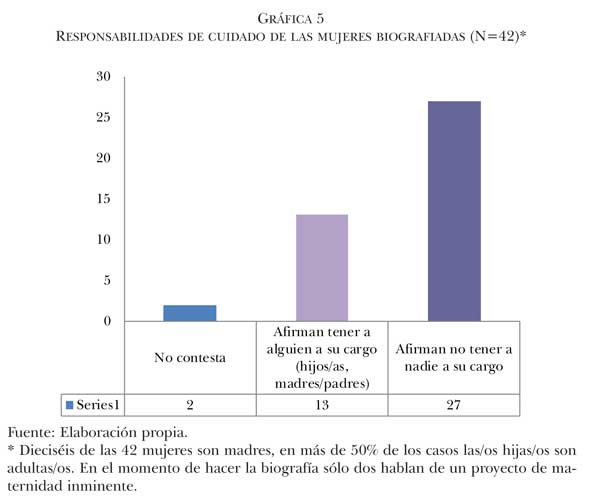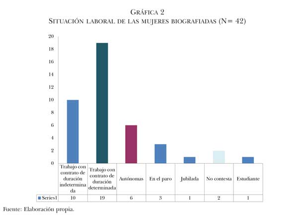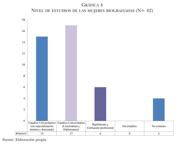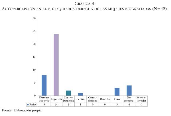 Lo primero que habría que decir es que las mujeres que han participado en la investigación a través de su narración biográfica (por autoselección e invitación directa) tienen perfiles diversos. No obstante, comparten ciertas características: el deseo de llevar a cabo un proyecto participativo, la acumulación de un capital cultural formal (gráfica 4), la autoidentificación en el eje izquierda-derecha como mujeres de izquierda, centro izquierda o extrema izquierda (gráfica 3), la no realización de un proyecto de maternidad (gráfica 5) y la posesión de un trabajo en el momento de realizar la biografía (gráfica 2). Asimismo, estas mujeres advierten marcadas diferencias en el tipo de unidad familiar en el que viven, su socialización primaria en espacios rurales o ciudades, la disposición o no de un recorrido participativo previo, la noción de lo que significa participar y el hecho de constituir o no un CPSF. Con todo, a pesar de la diversidad inherente a todo grupo social, es posible trazar un perfil de las mujeres que “consumen” estos proyectos de innovación. Se trata de mujeres con un capital cultural relativamente alto, sin proyectos de maternidad en proceso, con una fuente de capital económico, de clase media y autoidentificadas como individuos de izquierdas.