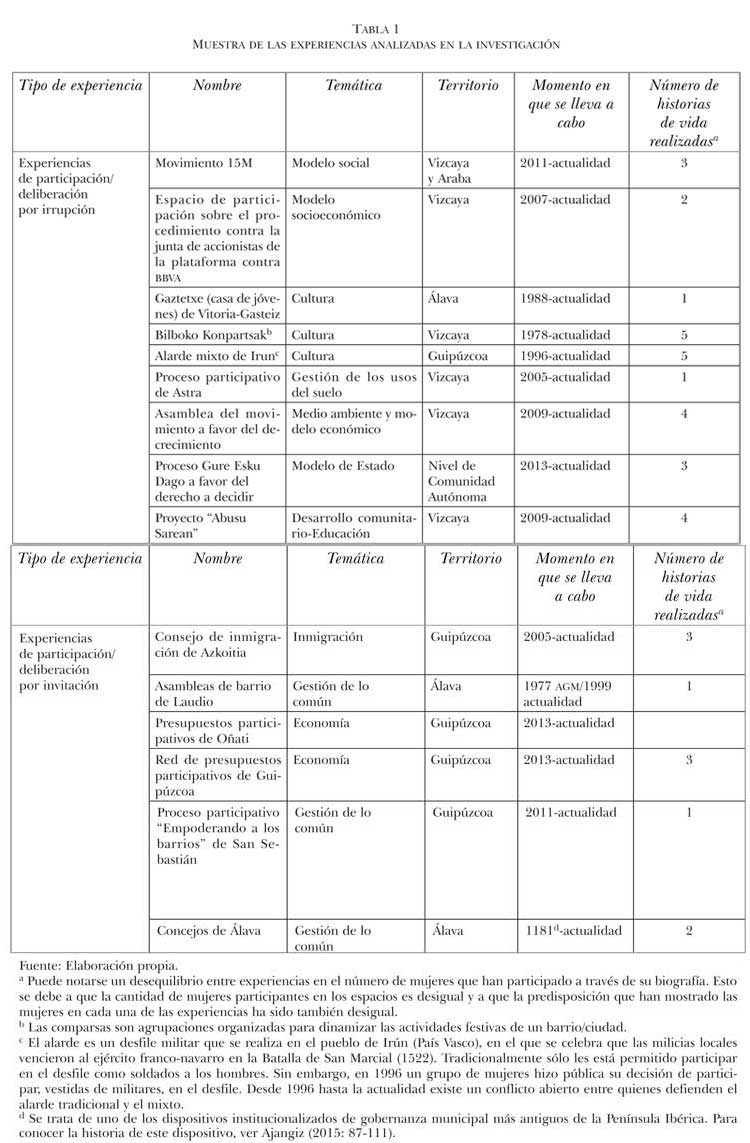 Con este objetivo hemos analizado la participación que han tenido las mujeres en 15 procesos participativos de carácter mixto (en los que participan conjuntamente hombres y mujeres) detallados en la tabla 1, que se han desarrollado entre 1978 y 201418 en el País Vasco (España).