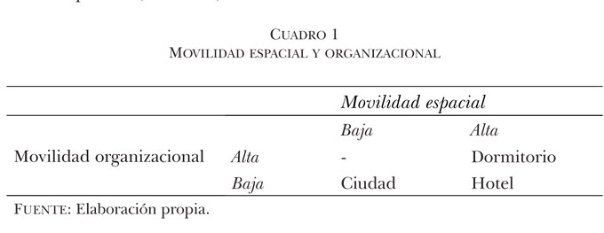 Aquí se ha mostrado cómo cada modelo produce encadenamientos productivos, formaciones urbanas y relaciones específicas entre producción, trabajadores y espacio. Una forma útil para simplificar estos modelos ha sido la noción de movilidad espacial. En este punto es posible repensar los vínculos entre ella y otro aspecto de la producción capitalista, la movilidad organizacional, es decir, la capacidad de un trabajador para dejar su trabajo, sea para irse a otra empresa o para dedicarse a otra ocupación (cuadro 1).