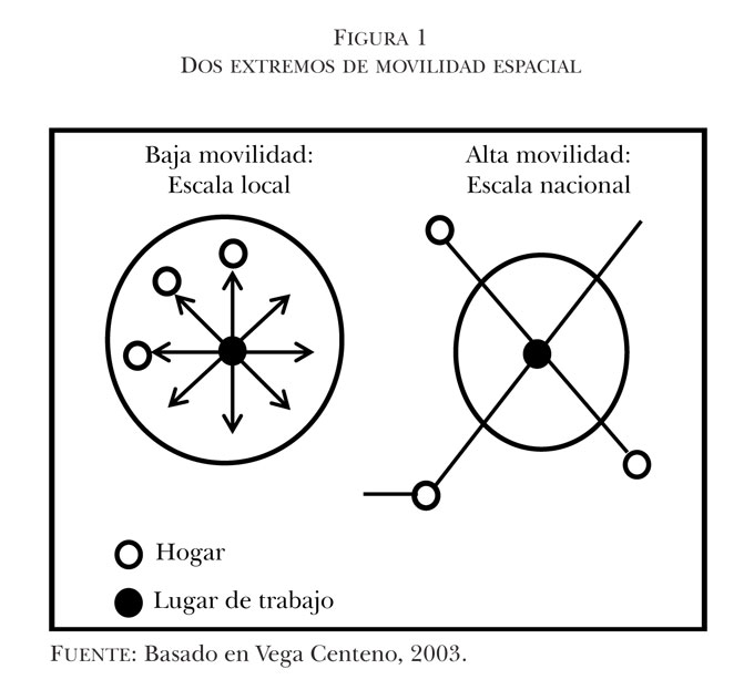 El concepto que utilizo en este artículo para aproximarme a dichas problemáticas es el de movilidad espacial, definido como la frecuencia de viajes entre diferentes localidades con la finalidad de alcanzar objetivos laborales (Hislop y Axtell, 2007). Es posible pensar en dos extremos (figura 1). Por un lado, en lugares de trabajo con poca movilidad; por ejemplo, en el enclave minero se dan dinámicas de interacciones constantes entre los obreros y sus familias, lo que permitiría el desarrollo de redes locales densas e identidades sólidas (Zapata, 1975).2