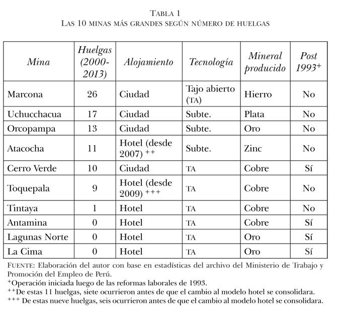 Sin embargo, las huelgas no se distribuyeron equitativamente en el país, y más bien se presentaron multiplicadas estrategias de lucha obrera. A pesar de haber cerca de 400 operaciones mineras y 200 sindicatos registrados, 45% de las huelgas mineras se concentraron en sólo 10 minas (Manky, 2014). Aunque las leyes laborales afectan de manera similar a todos los sindicatos que organizaron estas huelgas, esta concentración es llamativa, sobre todo porque de estas 10 minas, ocho funcionan bajo el modelo de ciudad minera. Incluso, al comparar minas similares en ganancias, el número de huelgas es muy variable. La tabla 1 muestra cómo, entre 2000 y 2013, dentro de las 10 minas con mayores utilidades en el país, se pasa de 26 huelgas en Marcona a 0 en Antamina.