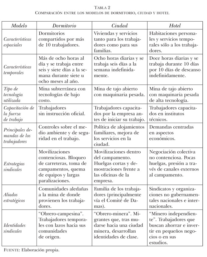 La tabla 2, en la siguiente página, resume las características de los modelos presentados. A pesar de que a partir de 1993 el modelo de hotel se ha vuelto el más popular del país, es necesario recalcar que todavía existen ciudades mineras. De hecho, incluso variantes del modelo de dormitorio pueden encontrarse en el caso de los trabajadores en algunas faenas de tamaño medio (Skogen, 2010), muchos de los cuales se dedican a labores que requieren poca capacitación, y vuelven a sus ciudades de origen una vez que han acumulado suficiente capital.