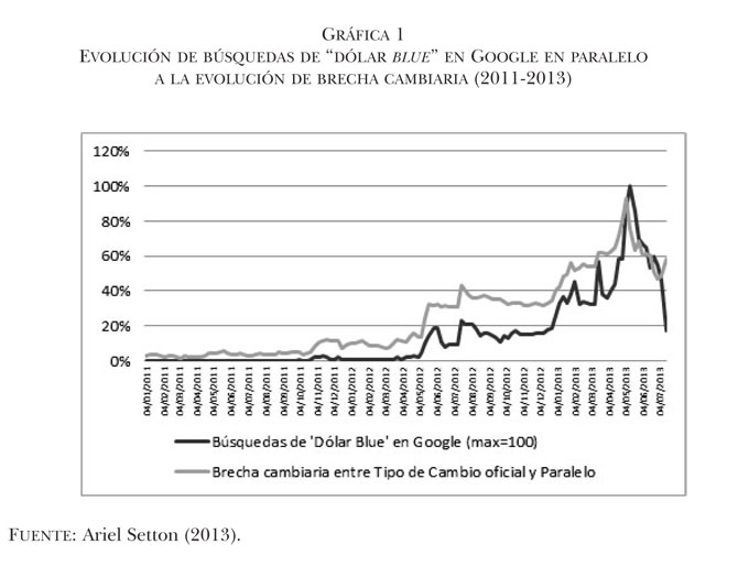 Setton, Ariel (2013). “Evolución de búsquedas de ‘dólar blue’ en Google en paralelo a la evolución de brecha cambiaria (2011-2013)” [en línea]. Disponible en <www.arielsetton.com.ar> [última consulta: 17/07/2013].